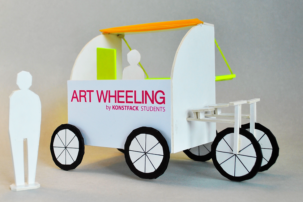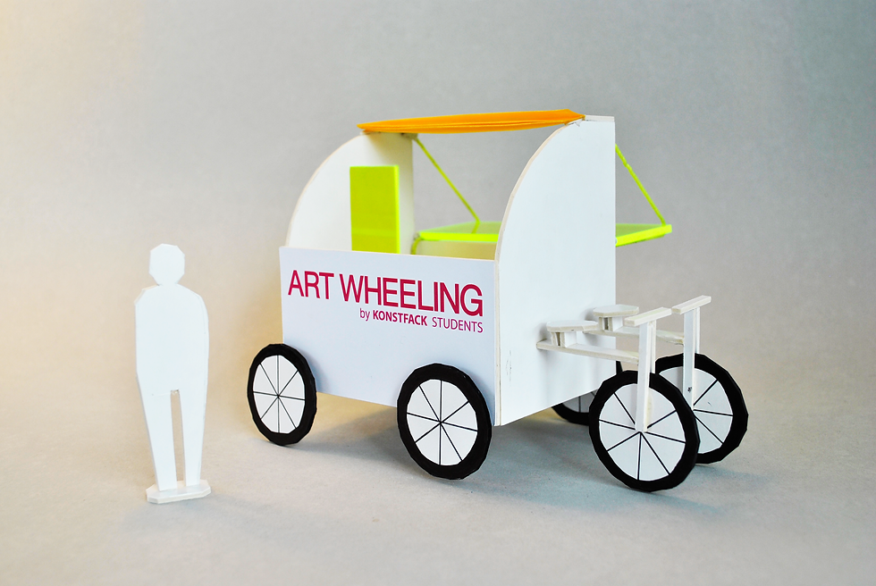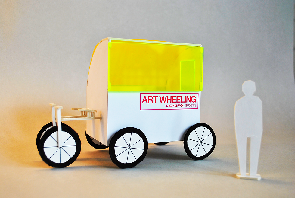 Art Wheeling is a moveable and environmentally friendly bicycle pop-up store. Students can easily move it around to markets, festivals and so on, to sell their work. Posters can be hung both on the inside and outside, and different, smaller items can be laid on the desk. The shop is 3 square meters and two people can cycle at the same time. The model in the pictures is made to a scale of 1:20.