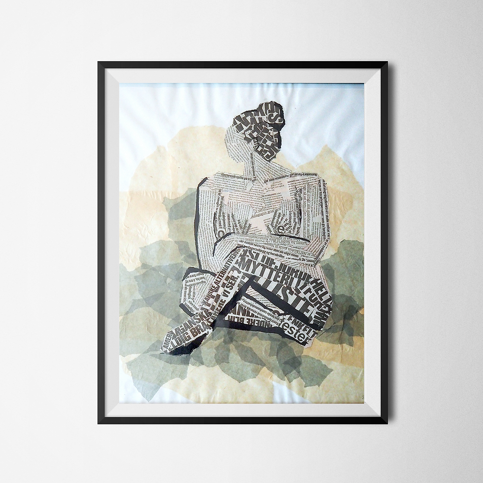 Collage made of silk paper and paper from newspapers. This was a study of the human body, surfaces, curves and lines. I used newspaper because I like to experiment with the texture of the typography. The color and size of the words can be used to create directions, shadows and light.